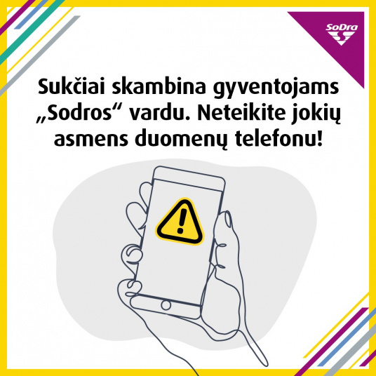 Primename, kad „Sodros“ darbuotojai niekada neprašo pateikti asmens duomenų telefonu. Jei kyla įtarimų, padėkite ragelį ir savarankiškai susisiekite su „Sodra“ numeriu +370 5 250 0883 arba el. paštu .