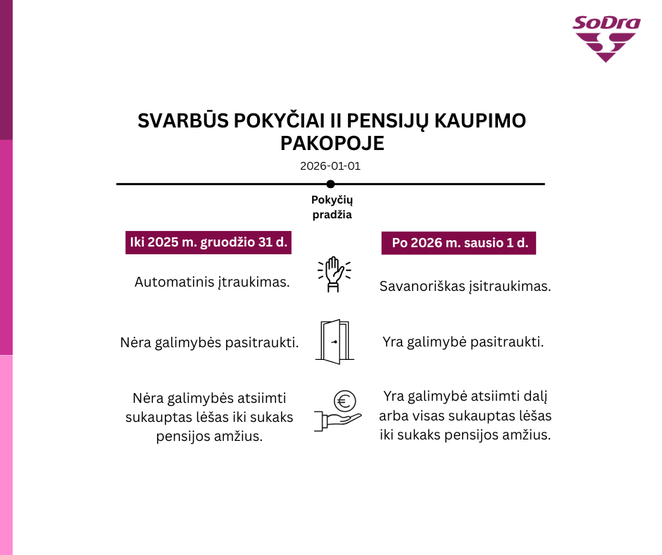 Nuo 2026 metų keičiasi antros pakopos pensijų kaupimo sistema – pereinama prie savanoriško modelio, o gyventojams suteikiama galimybė pasitraukti iš kaupimo, jei to pageidauja. Svarbu įsidėmėti, kad naujovės įsigalios nuo 2026 m. sausio 1 d., tad iki to laiko kaupime dalyvaujantiems gyventojams nereikia nieko daryti. Tai tinkamas metas susipažinti su informacija ir priimti apgalvotą asmeninį sprendimą.