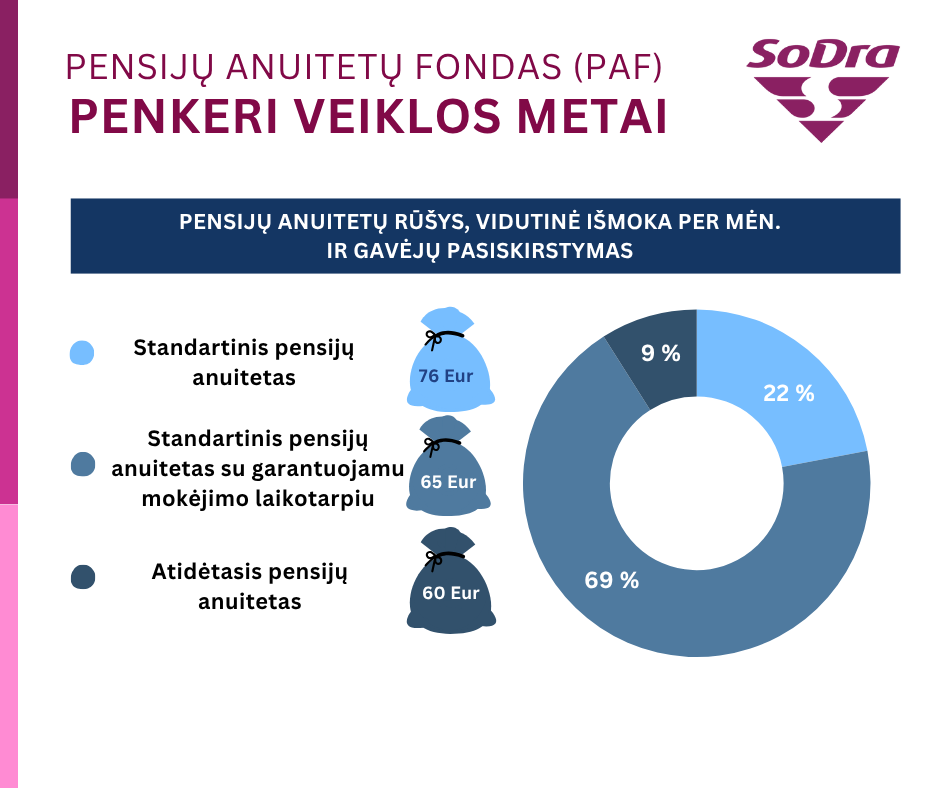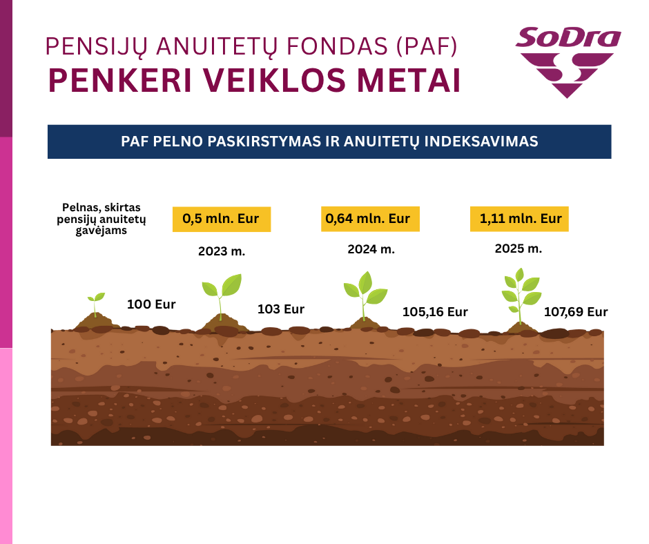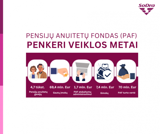 Jau beveik 5 tūkstančiai gyventojų kas mėnesį gauna papildomas išmokas prie pensijos iš „Sodros“ Pensijų anuitetų fondo. Per penkerius veiklos metus fondas dėl investavimo padidino savo turtą beveik 9 mln. eurų, o iš uždirbto pelno jau kelis metus didinamos išmokos. Šeštuosius veiklos metus fondas pasitinka reikšmingų pokyčių laikotarpiu, tačiau įsipareigojimai esamiems gavėjams ir toliau vykdomi.