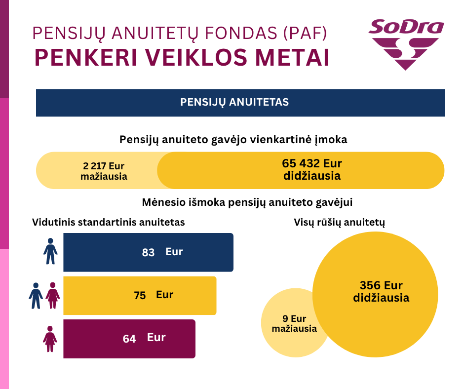 Didžiausia anuiteto išmoka šiuo metu yra beveik 356 eurai, o mažiausia – kiek daugiau nei 9 eurai. Didžiausią anuitetą gaunantis žmogus jį įsigijo už daugiau nei 60 tūkst. eurų, o mažiausios išmokos gavėjas – už 2 tūkst. eurų.