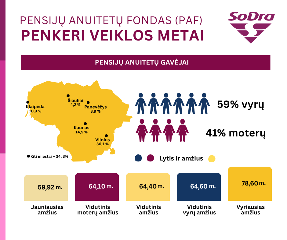 Tarp pensijų anuitetų gavėjų 59 proc. sudaro vyrai ir 41 proc. moterys. Vidutinis pensijų anuitetų gavėjo amžius – 64,4 metų. Jauniausiam anuitetą gaunančiam žmogui yra 59,9 metų, vyriausiam – 78,6 metų.