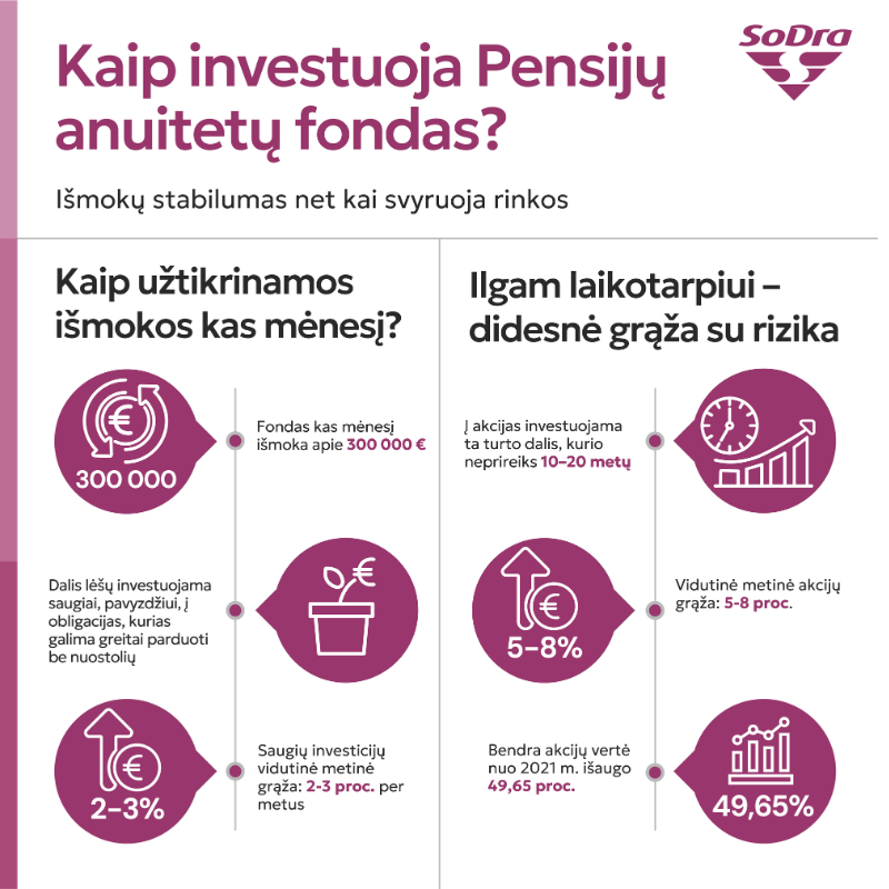 Nepaisant pastarųjų savaičių neramumų finansų rinkose, „Sodros“ Pensijų anuitetų fondas išlieka stabilus. Saugumą užtikrina pasirinktas investavimo modelis, kuris leidžia vykdyti išmokas net ir tuomet, kai rinkos svyruoja. Fondo tvarumą taip pat sustiprina sukauptas finansinis rezervas.