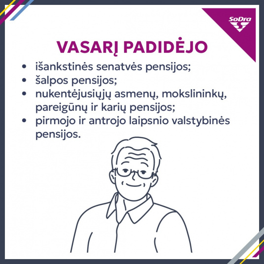 Vasarį padidėjo išankstinės senatvės pensijos, šalpos, nukentėjusiųjų asmenų, mokslininkų, pareigūnų ir karių pensijos, pirmojo ir antrojo laipsnio valstybinės pensijos. Gavėjai, gaunantys mažų pensijų priemokas, taip pat sulauks pasikeitusių išmokų.