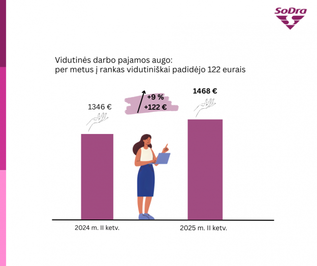 „Sodros“ duomenimis, 2025 m. antrąjį ketvirtį vidutinės darbo pajamos Lietuvoje padidėjo vidutiniškai 122 eurais į rankas ir pasiekė 1 468 eurus. Vidutinės visą mėnesį dirbusių darbuotojų darbo pajamos neatskaičius mokesčių, palyginti su tuo pačiu laikotarpiu prieš metus, padidėjo 215 eurų arba 9,8 proc. ir siekė 2 399 eurus.